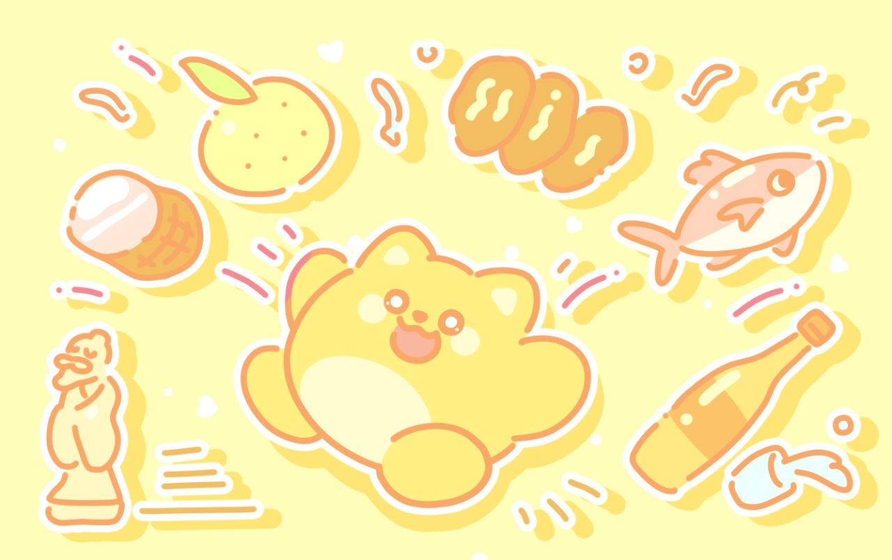 食いしんぼうポメロニアンと特産品をポップに配置しました。