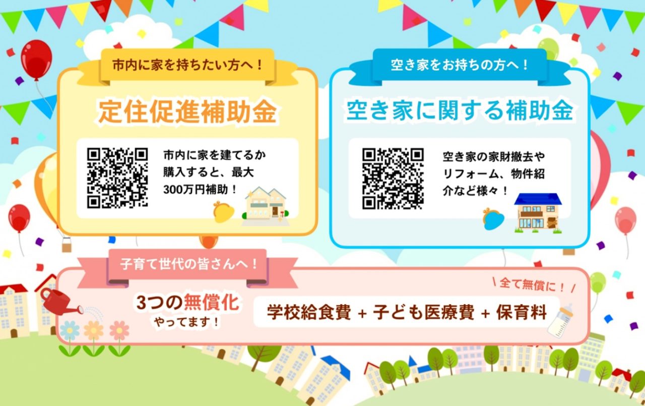 2024年から始まった定住促進補助金、空き家に関する補助金、子育てを応援する3つの無償化の概要をまとめました。